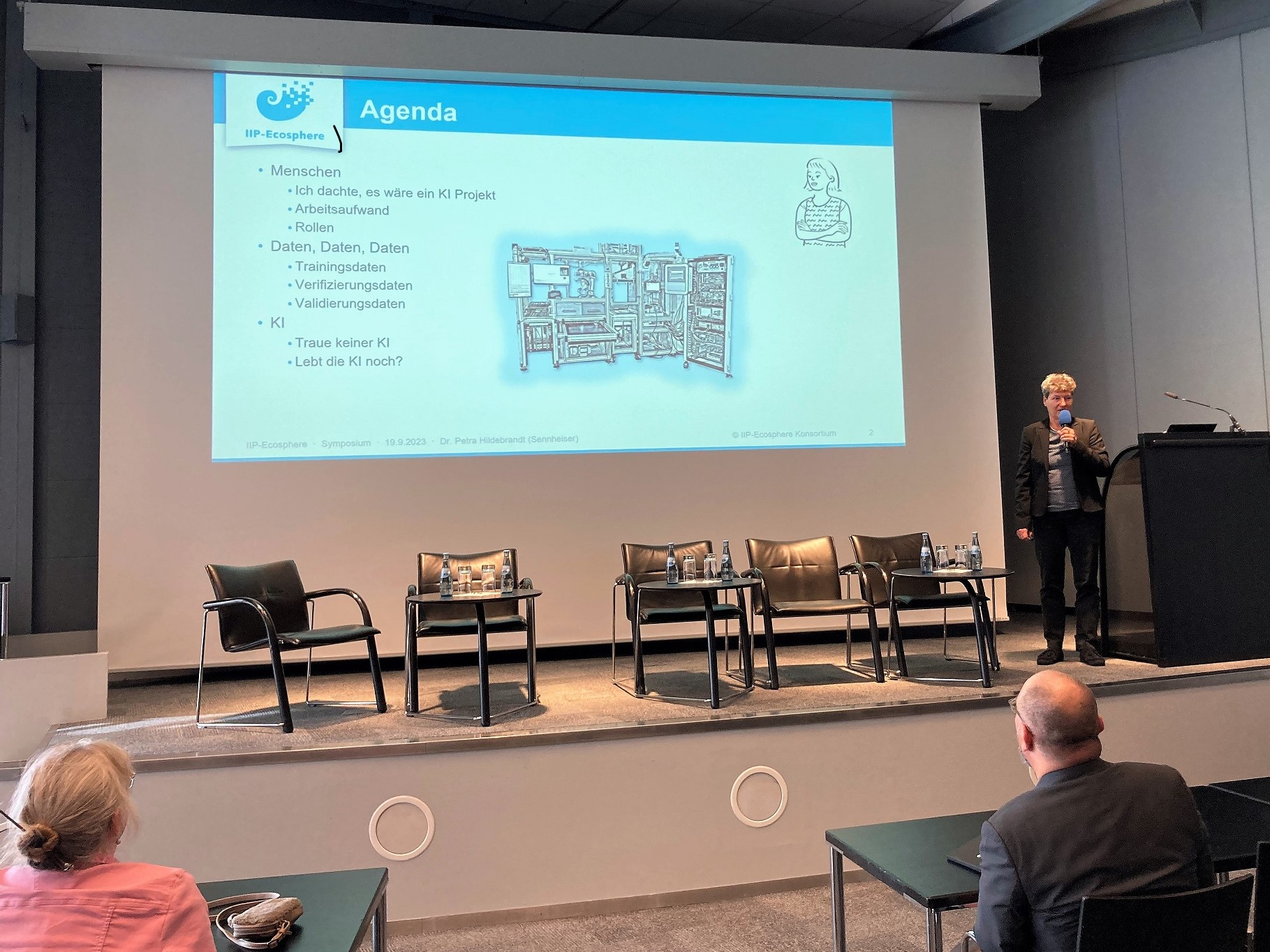 Dr. Holger Eichelberger stellte eines der Hauptergebnisse des Projekts vor: die offene IIoT-Plattform, die den Einsatz von KI in der Produktion ermöglicht. Die Plattform basiert auf offenen Standards, kann herstellerunabhängig verwendet werden und ist so konzipiert, dass sie bestehende Ressourcen und Bestandsysteme erweitern kann. Bereits existierende IIoT-Lösungen können in die Plattform integriert und mit KI-Lösungen angereichert werden. Da sie sich darüber hinaus durch eine hohe Konfigurierbarkeit auszeichnet, können Unternehmen und Entwickler die Plattform an den eigenen Bedarf anpassen. Die Frage, wie es nach Projektende weitergeht, hat Eichelberger ebenfalls beantwortet: Die Plattform wird unter dem Namen oktoflow weiterbetrieben. Auch andere Angebote von IIP-Ecosphere werden fortgeführt, etwa die Workshops, die aus dem Think Tank Geschäftmodelle entstanden sind. Weitere Ergebnisse und Erkenntnisse aus den Think Tanks und der Anwendung von KI in den Demonstratoren waren ebenfalls Themen des Symposiums. In ihrem Vortrag über Lessons Learned bei der Einführung von KI in der Funktionsprüfung bei Sennheiser hat sich Dr. Petra Hildebrandt den Faktor Mensch vorgenommen. Bei der Umsetzung eines KI-Projektes alle Beteiligten einzubinden und mitzunehmen, war dann doch ein größere Herausforderung als gedacht.