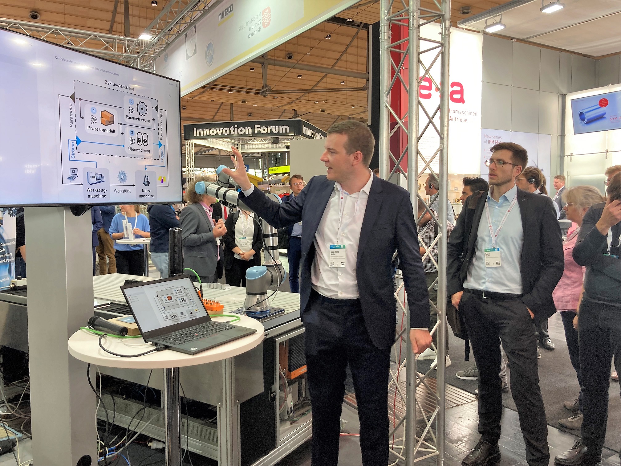Weitere Live-Demonstrationen gab es zur KI-basierten Prozessstabilität in der Glasformung und zum Demonstrator Zyklenoptimierung: Das IIP-Ecosphere-Team von Gildemeister Drehmaschinen, Artis Marposs Monitoring Solutions und dem Institut für Fertigungstechnik und Werkzeugmaschinen (IFW) der Leibniz Universität Hannover hat gemeinsam ein KI-basiertes Assistenzsystem für Maschinenbediener entwickelt. Das Ziel: Zerspanzyklen parametrieren und überwachen. Komplexe Zerspanprozesse sind ein wesentlicher Teil der industriellen Wertschöpfung. Sogenannte Zyklen (Programme) steuern dabei die Bewegungsabläufe von Werkstück und Werkzeug. Der Demonstrator betrachtet den Wälzschälzyklus, der zur Fertigung von Verzahnungen eingesetzt wird.